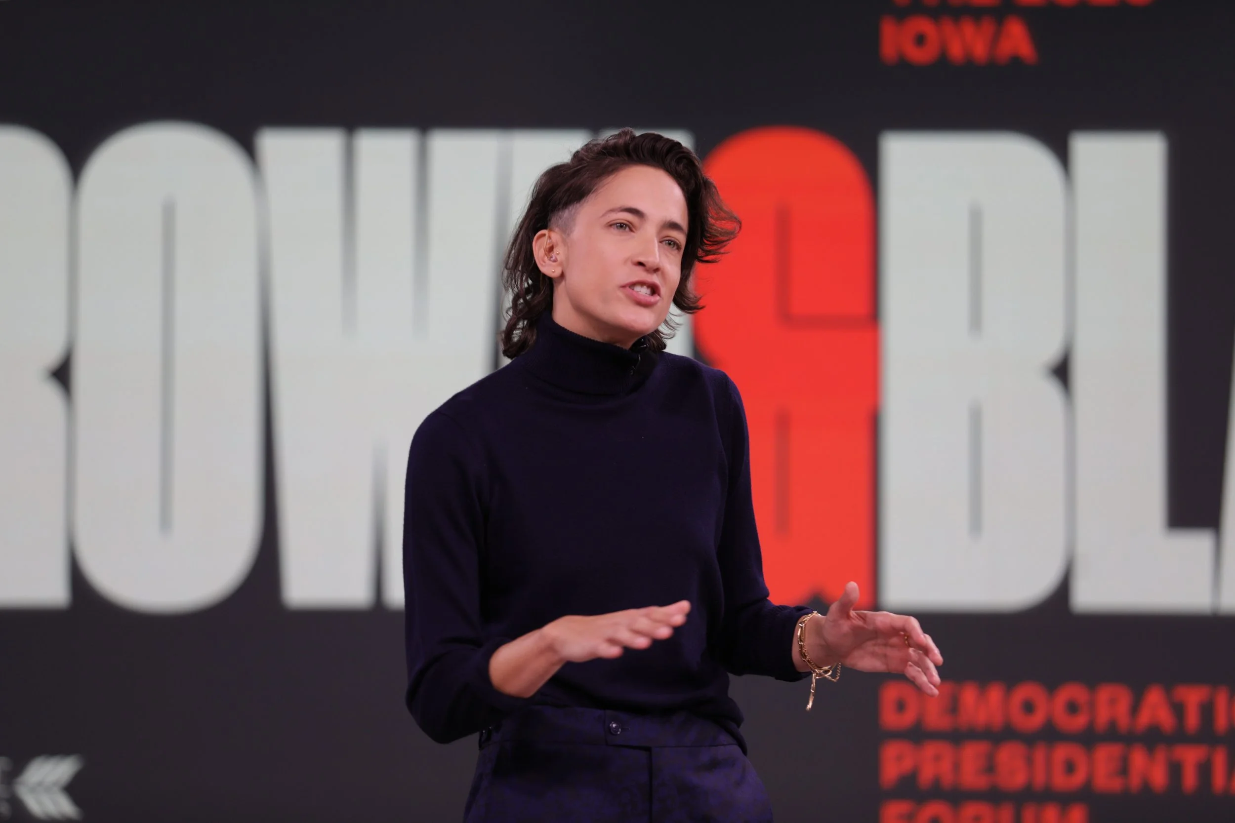The cutout animations of each candidate was an interesting way to build on the aesthetic. It helped to differentiate between the unusually high number of candidates by featuring the breadth of their personalities. The movements explicitly refer to their signature mannerism, from Bernie Sanders’ punctuating index finger to Andrew Yang’s enthusiastic thumb. The show was essentially a long conversation and emphasizing those small details draws to focus the unique ways the candidates express their ideas.